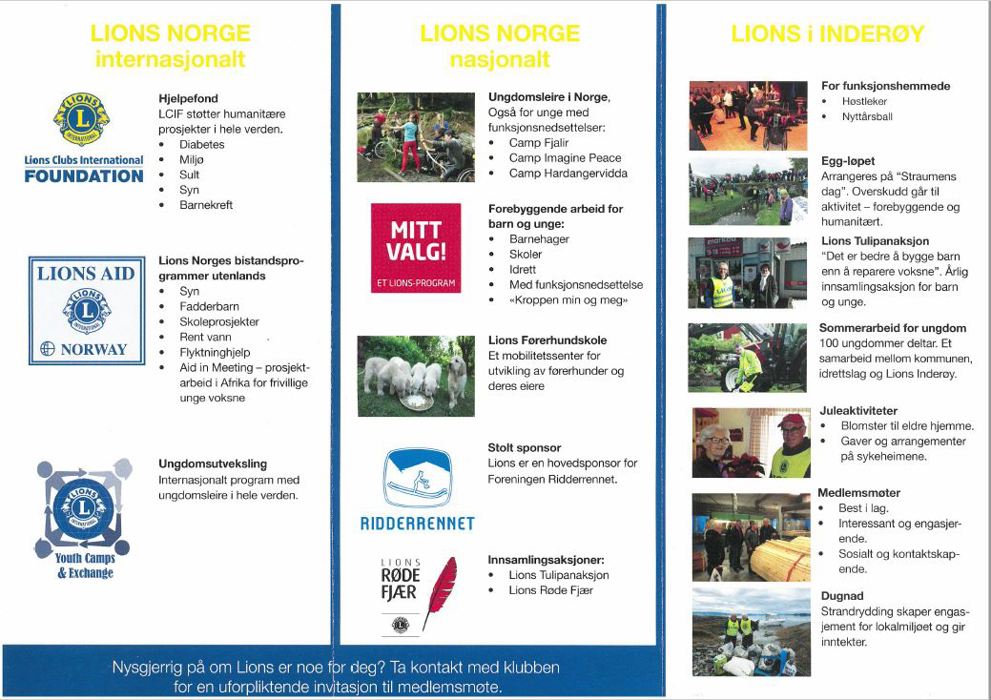 Lions Club Inderøy har laget en folder som sier litt om hva klubben jobber med lokalt, og litt om Lions Club generelt. Ta gjerne kontakt om du ønsker mer informasjon. Greier du å se hvilken aktivitet som har mottoet "Det er bedre å bygge barn, enn å reparere voksne"?